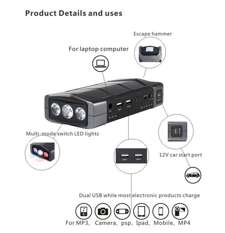 Dùng để cứu hộ khởi động xe khi bình yếu,có chức năng đèn pin, đèn flash cứu hộ khi cần,ngoài ra có thể dùng làm sạc dự phòng cho điện thoại khi cần !